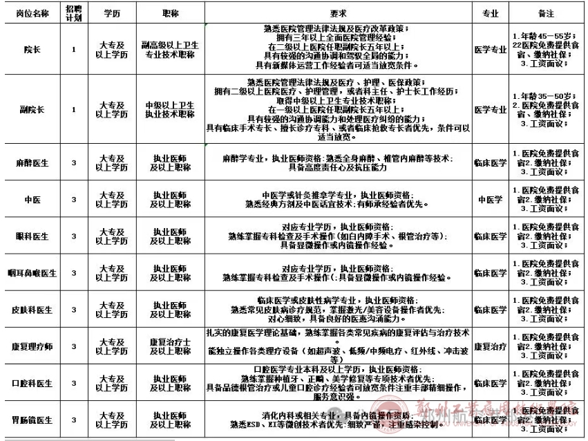 医师岗位:麻醉医生、中医、眼科医生、咽耳鼻喉医生、皮肤科医生、康复理疗师、口腔科医生、胃肠镜医生。